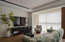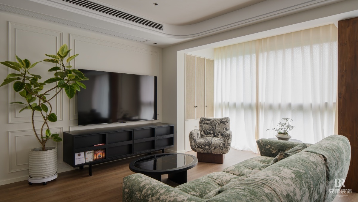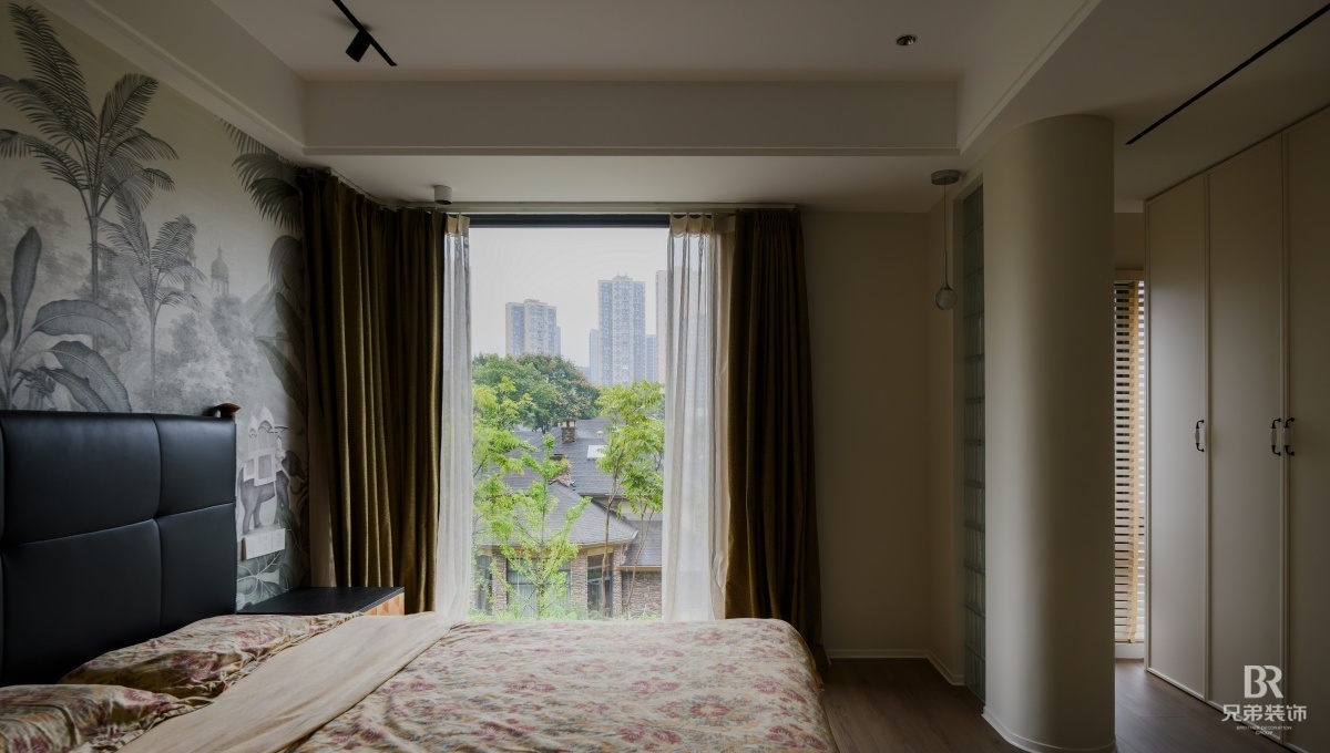 客厅用绿色迷彩沙发做视觉C位,搭配圆形玻璃茶几和花纹单椅,再点缀绿植呼应,整个空间个性十足还不显乱。 餐厨采用一体设计,原木餐桌配藤编铁艺椅,自然又轻盈。 卧室是治愈天地,热带风背景搭配舒适大床,每天醒来都像在度假;拉开窗帘,就将城市绿意尽收眼底。