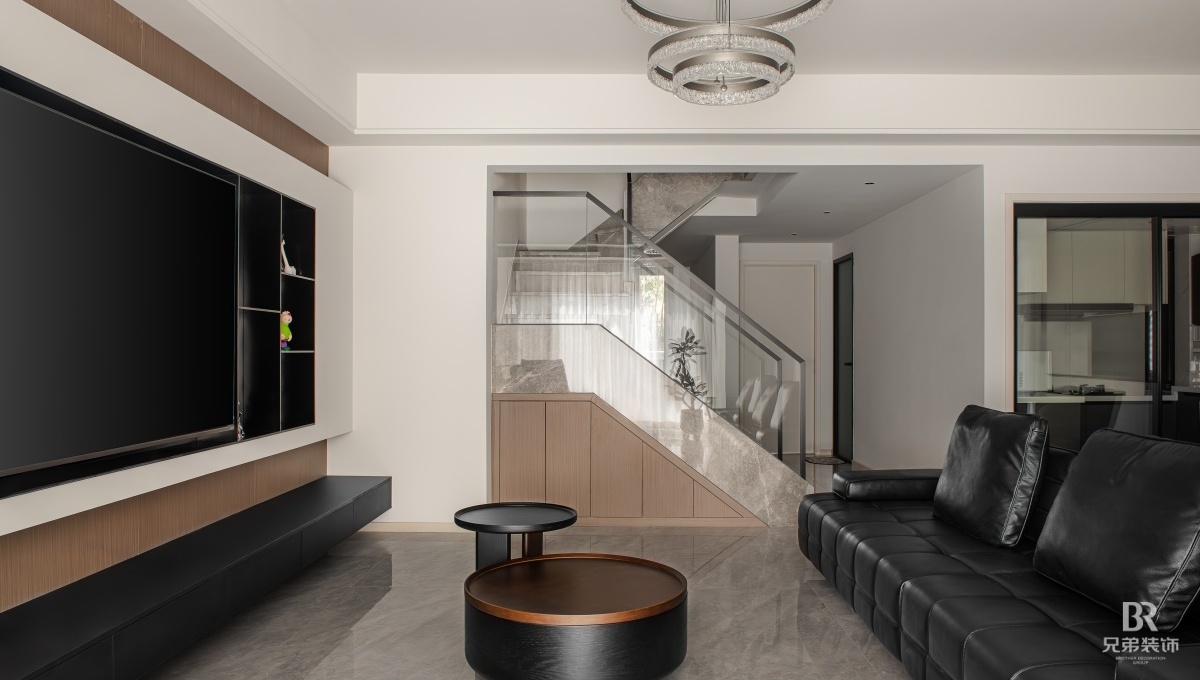黑框玻璃扶手+石材踏步,简约不简单,挑空的楼梯间连通1楼和2楼,整个空间瞬间通透感拉满,完全没下叠的压抑感~