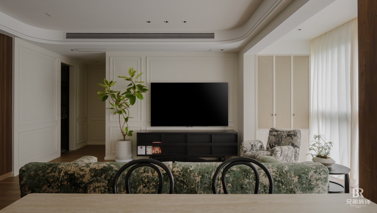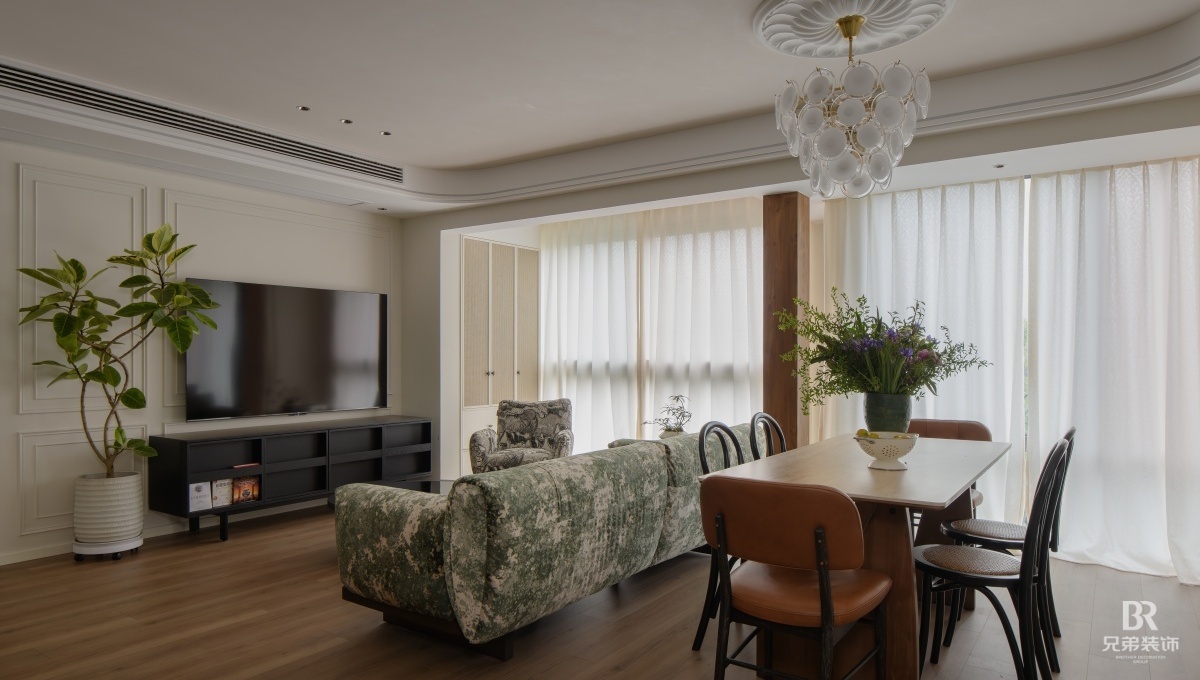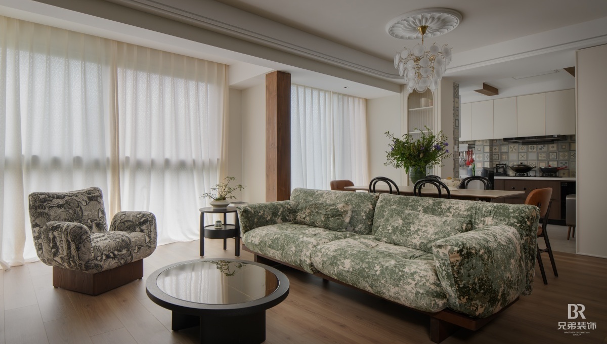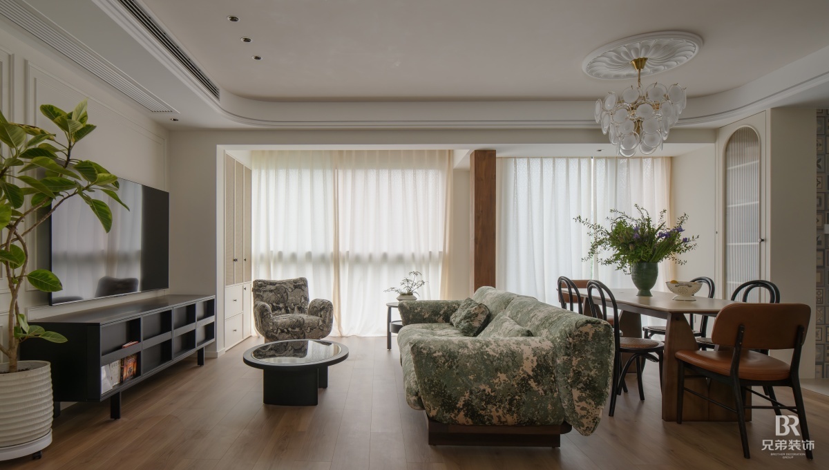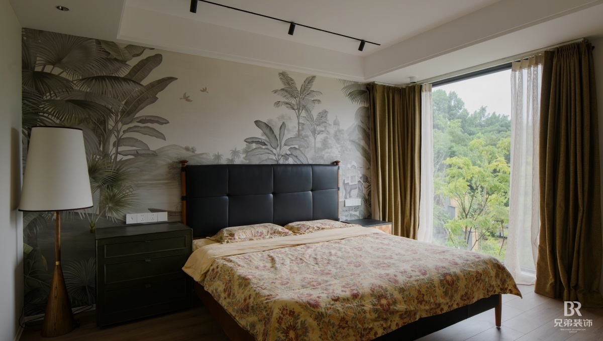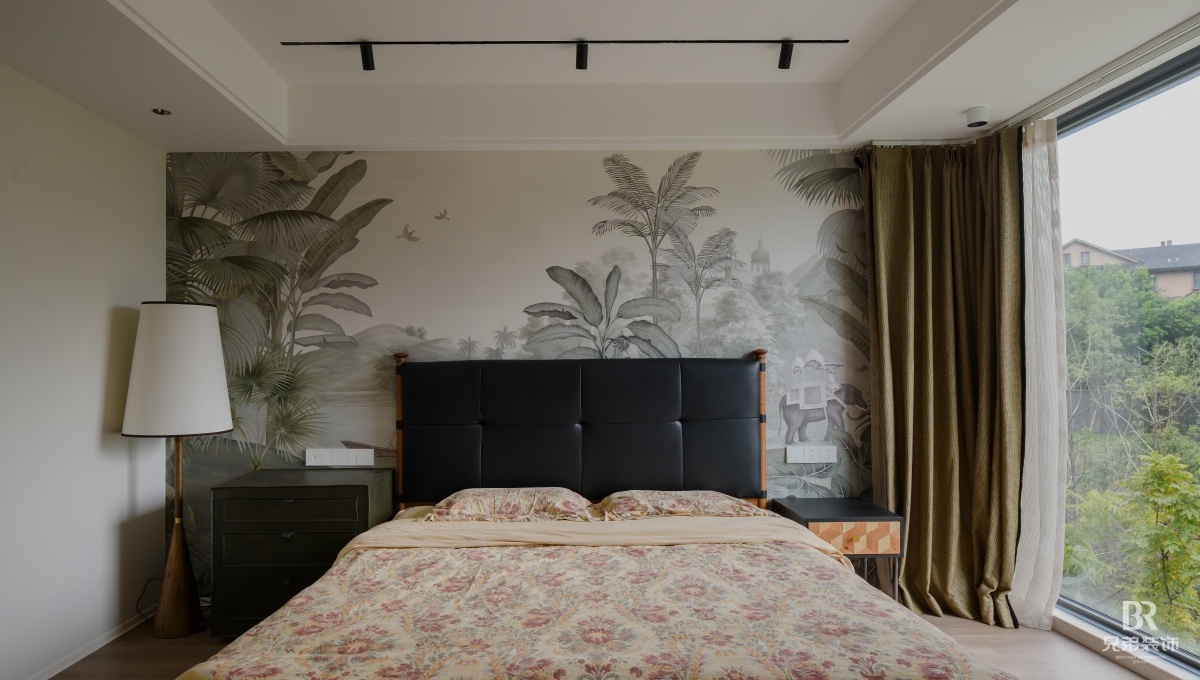 客厅用绿色迷彩沙发做视觉C位,搭配圆形玻璃茶几和花纹单椅,再点缀绿植呼应,整个空间个性十足还不显乱。 餐厨采用一体设计,原木餐桌配藤编铁艺椅,自然又轻盈。 卧室是治愈天地,热带风背景搭配舒适大床,每天醒来都像在度假;拉开窗帘,就将城市绿意尽收眼底。