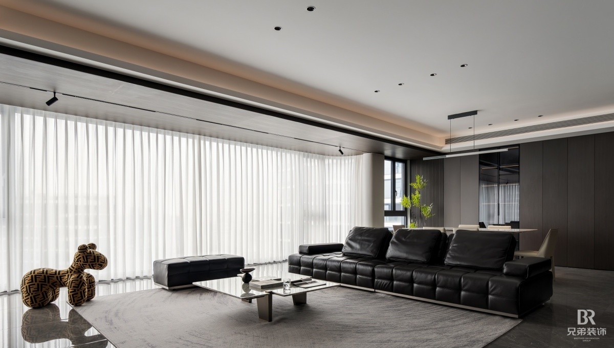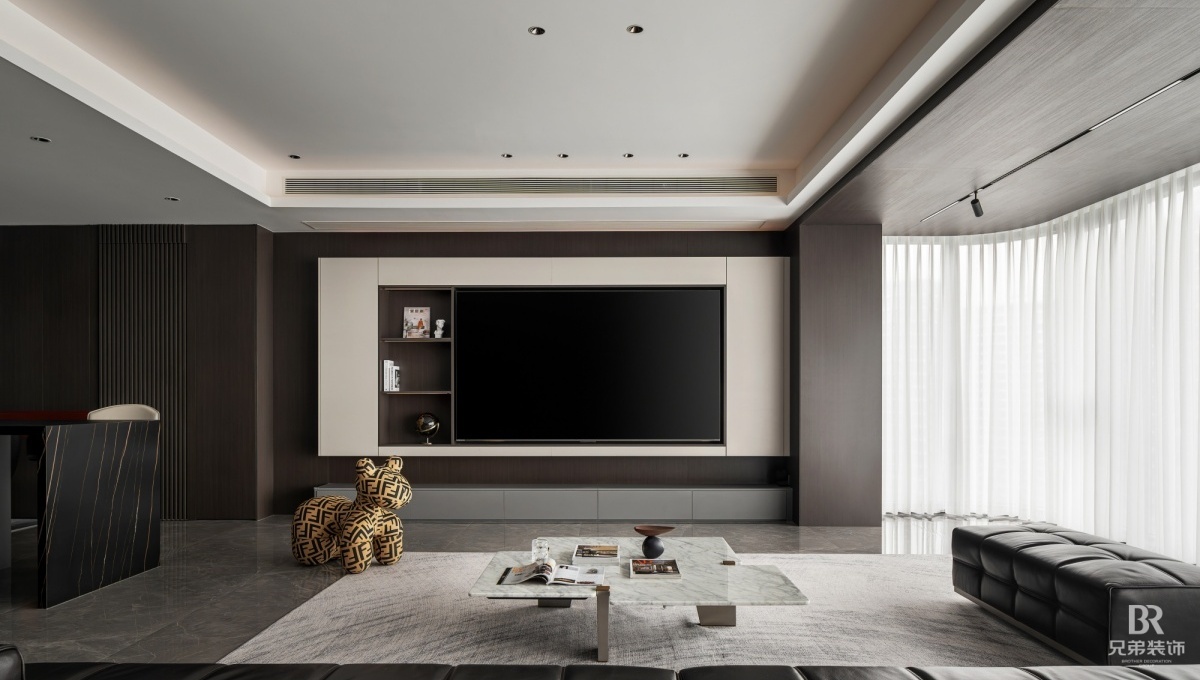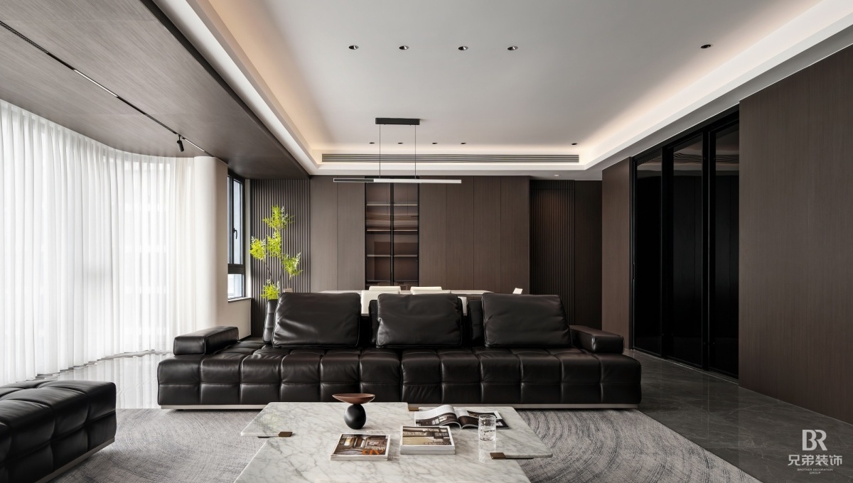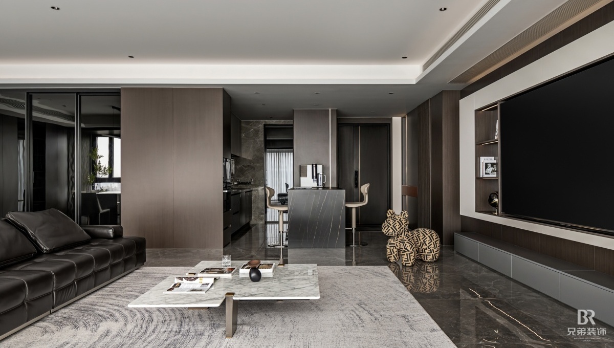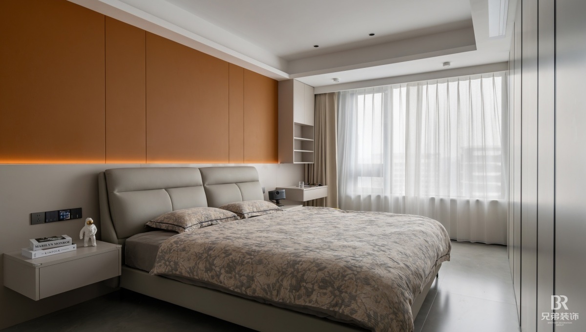 客厅以深棕为主调,黑色皮沙发沉稳大气,搭配大理石茶几,高级感拉满。电视墙嵌入柜体,收纳与展示兼具,角落的创意小摆件超吸睛~ 卧室用橙色背景墙点亮空间,柔和灯光营造温馨氛围, 简约的定制柜体,让收纳有序又美观。 大平层的通透感,在这里体现得淋漓尽致,开放式布局让空间更显宽敞。在窗边摆上舒适单人椅,晒晒太阳、看看风景,超惬意!重庆 D10 天际的现代风大平层,把时尚与实用融合,每一处设计都藏着对生活的热爱,这就是我想要的家呀~
