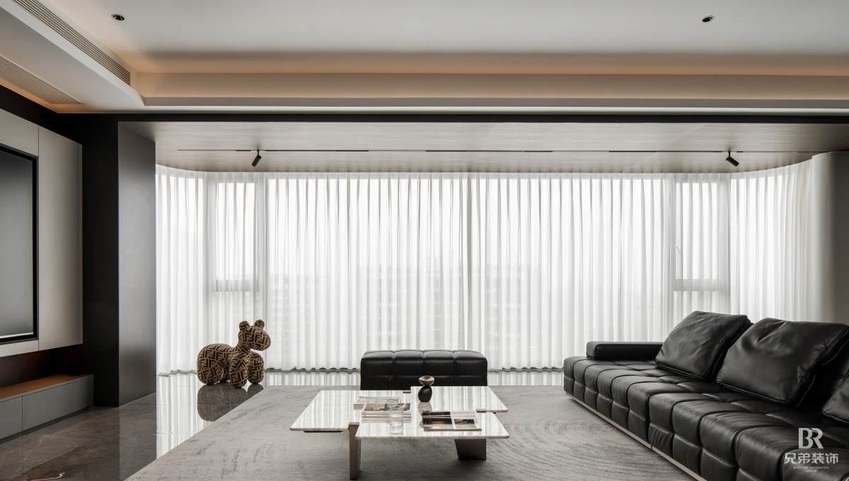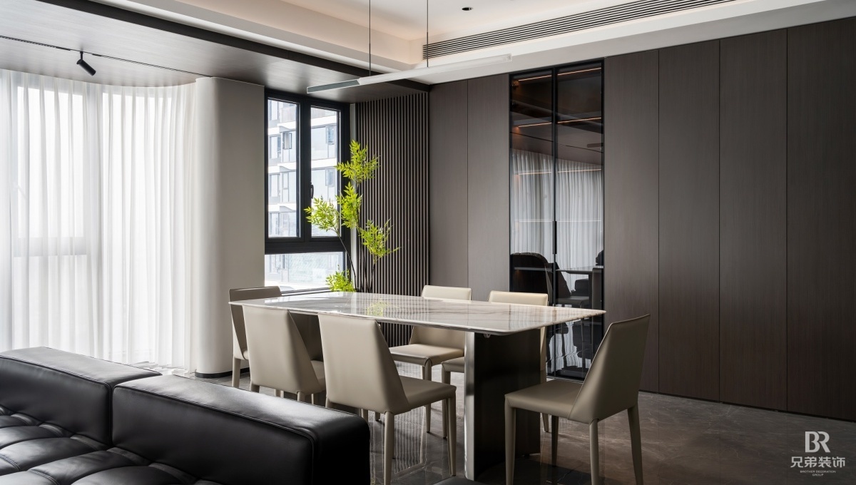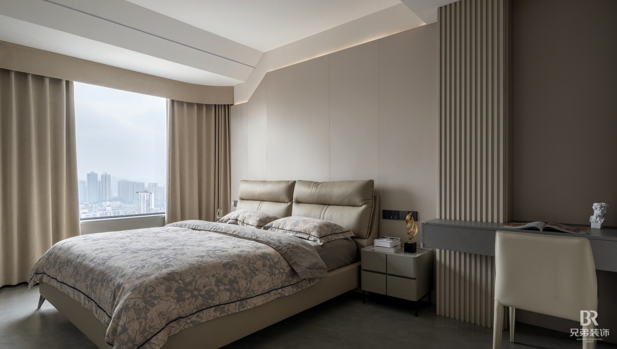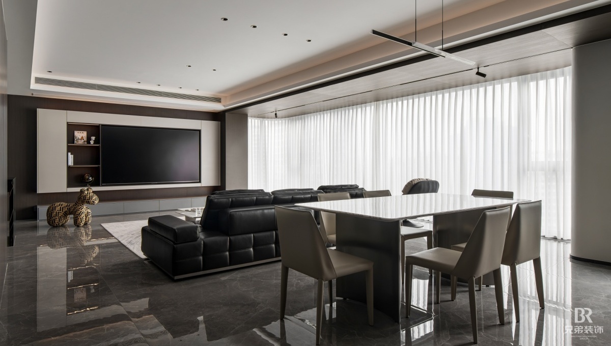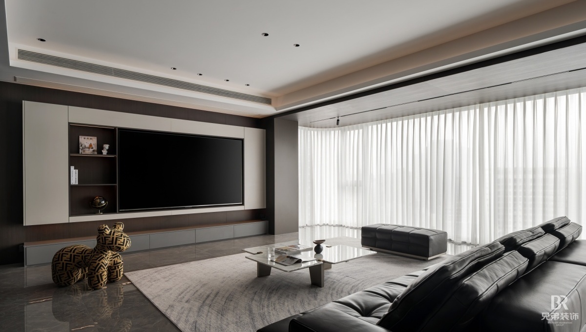 客厅以深棕为主调,黑色皮沙发沉稳大气,搭配大理石茶几,高级感拉满。电视墙嵌入柜体,收纳与展示兼具,角落的创意小摆件超吸睛~ 卧室用橙色背景墙点亮空间,柔和灯光营造温馨氛围, 简约的定制柜体,让收纳有序又美观。 大平层的通透感,在这里体现得淋漓尽致,开放式布局让空间更显宽敞。在窗边摆上舒适单人椅,晒晒太阳、看看风景,超惬意!重庆 D10 天际的现代风大平层,把时尚与实用融合,每一处设计都藏着对生活的热爱,这就是我想要的家呀~